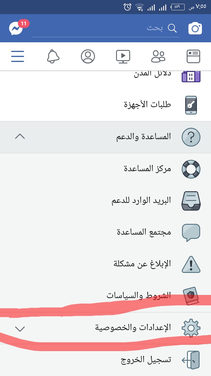 نقوم بالدخول الى صفحه الإعدادات الخاصه بصفحه الفيسبوك ثم نختار الإعدادات والخصوصيه كما هو موضح في الصوره التاليه: